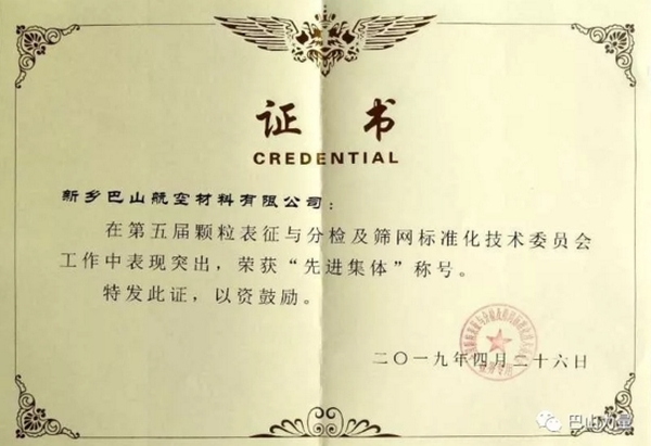 2019年5月,全國顆粒表征與分檢及篩網(wǎng)標準化技術(shù)委員會換屆暨六屆一次會議在江蘇常州召開,會上,巴山公司黨委副書記、總經(jīng)理白潛洋被聘為全國篩標委副主任委員,并代表巴山公司參會。巴山公司作為GB/T6003.1、GB/T6003.2的主要起草單位,GB/T17492的參與起草單位,在全國顆粒表征與分檢及篩網(wǎng)標準化技術(shù)提升中表現(xiàn)突出,具有較強的影響力及引領(lǐng)作用,在此次大會中獲得“**集體”稱號。